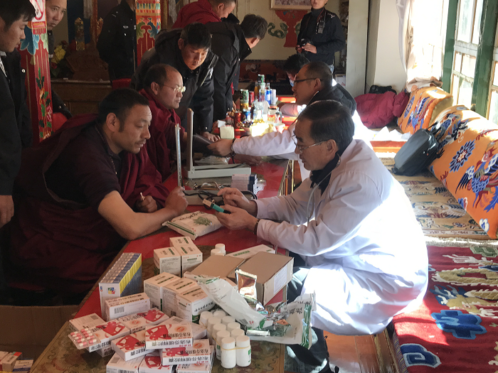 【概要:12月10日上午,在西藏阜康醫(yī)院名譽(yù)院長、慢病管理中心主任張德才的帶領(lǐng)下,阜康義診分隊(duì)一行6人來到楚布寺,為附近的僧侶和群眾免費(fèi)測血壓、測血糖、并發(fā)放常見疾病的藥物?!?/span>