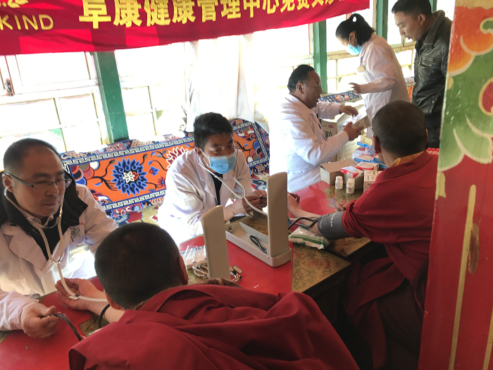 隨后,義診活動井然有序地開始了,張?jiān)洪L和田豐輝醫(yī)生負(fù)責(zé)測血壓,護(hù)士唐宗青測血糖,瓊瑪負(fù)責(zé)發(fā)放藥品,占堆(我院體檢中心醫(yī)務(wù)人員)對每一位血壓、血糖高的僧人、群眾進(jìn)行登記,有利于以后對他們的健康進(jìn)行隨訪跟蹤,了解他們有無不適以及血壓、血糖情況,督促他們的按時服藥、并指導(dǎo)他們健康的生活方式。在義診體檢過程中,一名76歲的老人,血壓200/120mmHg,經(jīng)過詢問,老人身體并沒有不適,在詳細(xì)的給老人講解了高血壓對身體健康的影響,以及高血壓帶來的危害后,并給予老人免費(fèi)發(fā)了治療高血壓的藥物,囑咐他這幾天要每天規(guī)律服用降壓藥物、監(jiān)測血壓,直至血壓在正常范圍后可以改為三到五天測一次血壓,但降血壓藥物不能停止,老人欣然接受意見,并握手致謝。