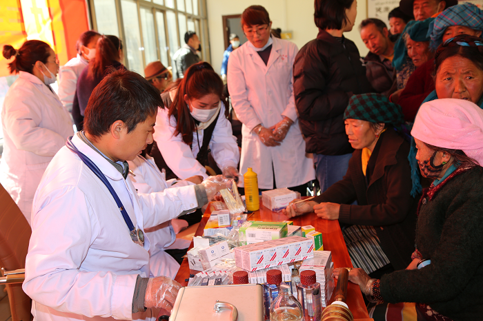 在義診過程中,63歲的貢桑老人患有比較嚴(yán)重的風(fēng)濕關(guān)節(jié)炎,膝關(guān)節(jié)紅腫變形,阜康義診醫(yī)療隊(duì)醫(yī)師格曲為她進(jìn)行了火罐治療,并囑咐她平時(shí)要注意保暖、不要受涼,每天晚上用熱水泡腳,還建議她配合針灸治療。87歲的玉珍老人在測量血壓時(shí)發(fā)現(xiàn)血壓偏高,在詢問得知“平時(shí)經(jīng)常頭暈”的情況,醫(yī)護(hù)人員為她發(fā)放了降壓藥品,并建議她去正規(guī)的醫(yī)療機(jī)構(gòu)接受系統(tǒng)的檢查與治療。