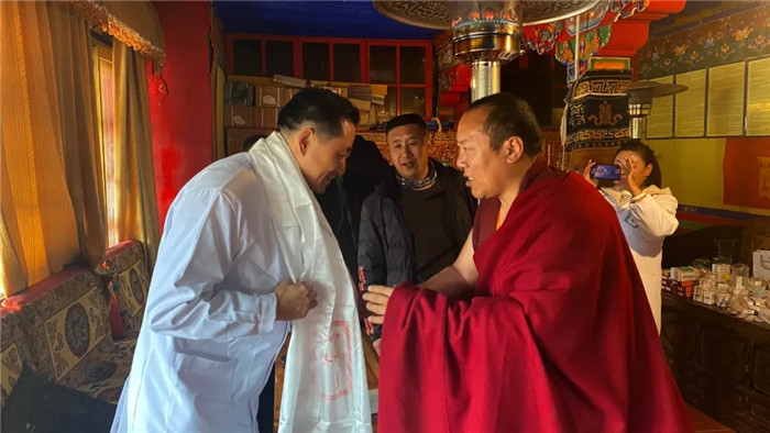 義診結(jié)束后,甘丹寺經(jīng)師阿旺曲帕為義診組每位成員獻上哈達,以表達對阜康醫(yī)院的感激之情。