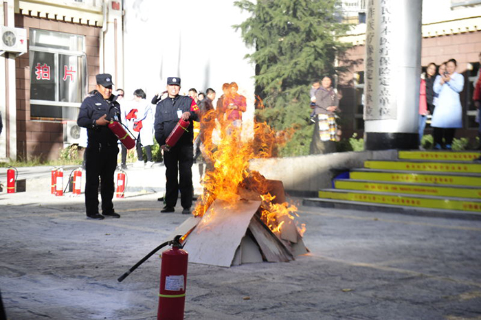 第二部分在我院住院區(qū)大院內(nèi),消防隊員進(jìn)行了現(xiàn)場演示,講解了如何使用滅火器,并現(xiàn)場點燃了一堆火,使用滅火器將大火撲滅,以直觀的方式,告訴醫(yī)護(hù)人員如何使用滅火器材;我院員工也派出后勤、臨床代表參加了演練。