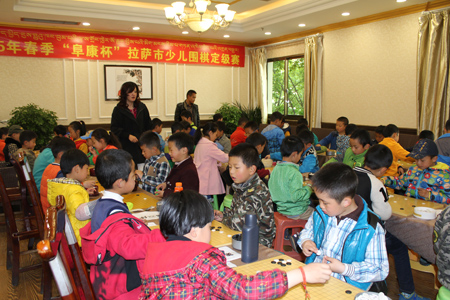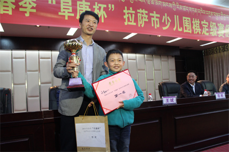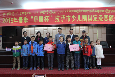 3月25日比賽結(jié)束后“復(fù)康杯”少兒圍棋定級(jí)賽頒獎(jiǎng)儀式開始,拉薩棋院院長(zhǎng)王斌、西藏阜康醫(yī)藥發(fā)展有限公司總經(jīng)理劉瀟瀟、西藏阜康醫(yī)藥發(fā)展有限公司總經(jīng)理陳彬、拉薩棋院圍棋部副主任趙鈞以及棋院老師陳學(xué)滸、袁文琴出席了本次會(huì)議。 王斌院長(zhǎng)在頒獎(jiǎng)儀式表示,很高興能夠舉辦拉薩市首屆“阜康杯”少兒圍棋定級(jí)賽,他向比賽獲勝者表示衷心的祝賀,希望他們能再接再厲繼續(xù)學(xué)習(xí)圍棋。他了解到很多家長(zhǎng)對(duì)拉薩市棋院選址郵政賓館非常滿意,這里環(huán)境清幽,非常適合教學(xué),他當(dāng)場(chǎng)表示郵政賓館二樓已經(jīng)被棋院斥資180萬(wàn)元租賃6年,至少在6年以內(nèi)棋院不會(huì)從新選址。王斌表示,目前,拉薩棋院正在向上級(jí)有關(guān)部門申請(qǐng)圍棋段位資格證的相關(guān)事宜,如無意外,預(yù)計(jì)在今年年底能夠申請(qǐng)成功,完成圍棋段位資格證的申請(qǐng),不僅能給我區(qū)圍棋事業(yè)的發(fā)展帶來很大的幫助同時(shí)也能讓我區(qū)更多的圍棋愛好者參與到此次項(xiàng)目。