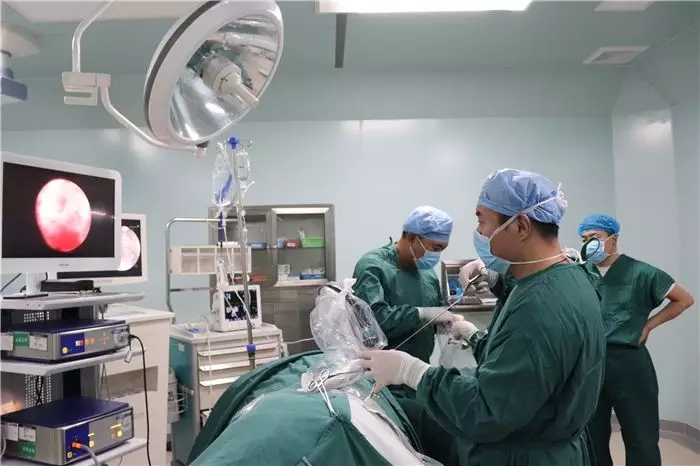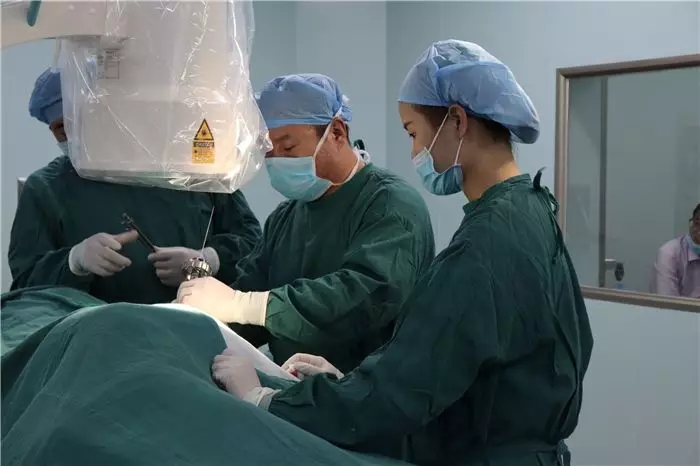 13:00時(shí),徐鑫一行來到病房,對(duì)即將接受手術(shù)的患者進(jìn)行術(shù)前評(píng)估,看過核磁共振和CT檢查資料,通過交流討論最終確定了手術(shù)方案。13:35分患者被推進(jìn)手術(shù)室,本次手術(shù)由徐鑫和阜康醫(yī)院骨科醫(yī)師李延軍共同完成。手術(shù)運(yùn)用BEIS技術(shù),在定位階段專家們多次透視確保儀器直達(dá)患處,以確保摘除髓核準(zhǔn)確無誤、減少患者創(chuàng)傷。髓核摘除后,患者疼痛麻木感隨即消失,手術(shù)圓滿成功,16:25分患者被推出手術(shù)室,專家嚴(yán)謹(jǐn)細(xì)致的作風(fēng)以及精湛的技術(shù)贏得醫(yī)務(wù)人員的掌聲。椎間孔鏡微創(chuàng)手術(shù)的重點(diǎn)在于透視定位,只有精準(zhǔn)定位才能保證準(zhǔn)確摘除髓核,減少患者疼痛與創(chuàng)傷。