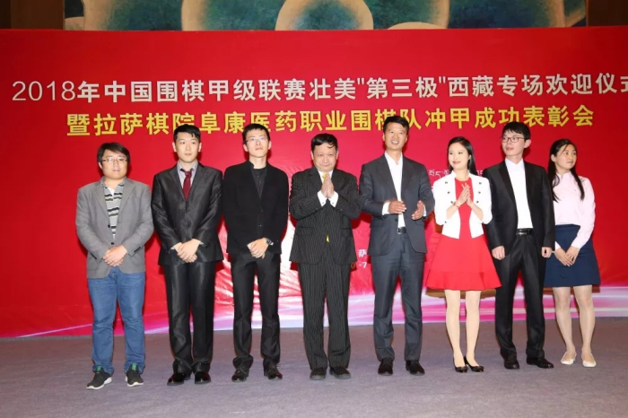 10月7日,2018年中國(guó)圍棋甲級(jí)聯(lián)賽壯美“第三極”西藏專場(chǎng)歡迎儀式暨拉薩棋院阜康醫(yī)藥職業(yè)圍棋隊(duì)沖甲成功表彰會(huì)在香格里拉大酒店隆重舉行。西藏自治區(qū)黨委副書記、政府主席齊扎拉,中國(guó)圍棋協(xié)會(huì)主席林建超,區(qū)政府副主席甲熱·洛桑旦增,國(guó)家體育總局棋牌運(yùn)動(dòng)管理中心黨委書記、主任、中國(guó)棋院院長(zhǎng)朱國(guó)平,中國(guó)棋院圍棋部部長(zhǎng)王誼,西藏自治區(qū)體育局黨組書記劉伯清、局長(zhǎng)尼瑪次仁,拉薩市委常委、常務(wù)副市長(zhǎng)占堆,自治區(qū)高級(jí)人民法院副院長(zhǎng)佘克冰,人民日?qǐng)?bào)西藏分社社長(zhǎng)鄧建勝,山東圍棋隊(duì)主教練、拉薩棋院名譽(yù)院長(zhǎng)、名譽(yù)總教練曹大元,世界冠軍羅洗河,山東景芝酒業(yè)隊(duì)領(lǐng)隊(duì)、齊魯晚報(bào)棋院院長(zhǎng)劉瑋,衢州巴格斯隊(duì)領(lǐng)隊(duì)薛廣靈,新華網(wǎng)西藏分公司常務(wù)副總編輯劉子明,拉薩棋院院長(zhǎng)、拉薩棋院阜康醫(yī)藥職業(yè)圍棋隊(duì)領(lǐng)隊(duì)王斌,中央電視臺(tái)圍棋欄目主持人、拉薩棋院常務(wù)副院長(zhǎng)陳盈以及山東隊(duì)、衢州隊(duì)的隊(duì)員們出席了本次活動(dòng)。