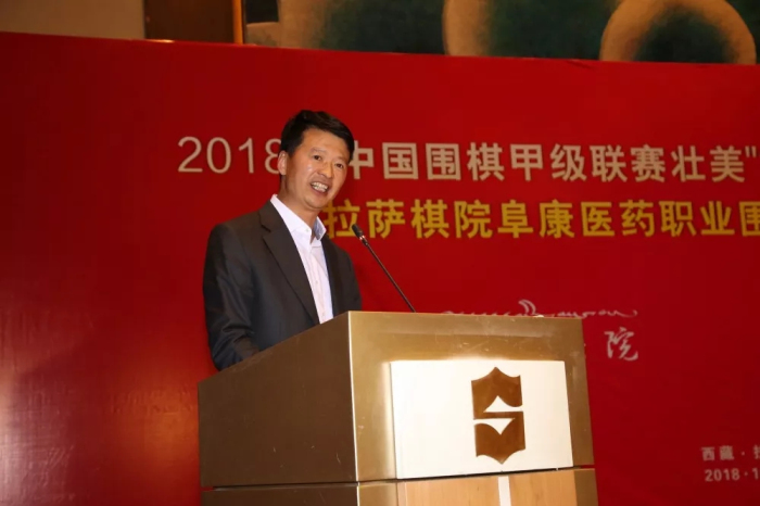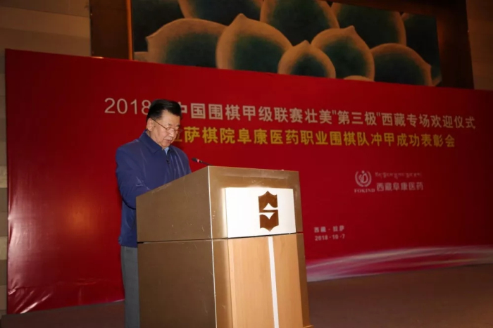 西藏自治區(qū)政府副主席甲熱·洛桑旦增代表自治區(qū)人民政府對(duì)各位嘉賓的到來表示熱烈歡迎。他說圍棋是一切棋類運(yùn)動(dòng)的鼻祖,是中華民族優(yōu)秀傳統(tǒng)文化的瑰寶,融合了軍事、哲學(xué)、詩(shī)詞等多種文藝形式,是中華民族幾千年來智慧的結(jié)晶,也是對(duì)人類文明的重要貢獻(xiàn)。在建設(shè)社會(huì)主義文化強(qiáng)國(guó)、體育強(qiáng)國(guó)、實(shí)現(xiàn)中華民族偉大復(fù)興的中國(guó)夢(mèng)進(jìn)程中,圍棋這樣一項(xiàng)由文化融進(jìn)體育的智慧運(yùn)動(dòng)承擔(dān)著重要的歷史使命。拉薩棋院西藏阜康醫(yī)藥職業(yè)圍棋隊(duì)沖甲成功是西藏體育發(fā)展的重大突破,也是社會(huì)力量推動(dòng)體育事業(yè)發(fā)展的典范。為此我代表自治區(qū)人民政府對(duì)西藏阜康醫(yī)藥職業(yè)圍棋隊(duì)沖甲成功表示熱烈祝賀,對(duì)社會(huì)各界支持西藏體育事業(yè)發(fā)展表示感謝,自治區(qū)政府將加快推進(jìn)體育事業(yè)改革、做強(qiáng)做大體育產(chǎn)業(yè),促進(jìn)全區(qū)體育事業(yè)再上臺(tái)階。祝愿2018年中國(guó)圍棋甲級(jí)聯(lián)賽壯美“第三極”西藏專場(chǎng)取得成功,祝愿西藏阜康醫(yī)藥職業(yè)圍棋隊(duì)在明年的甲級(jí)聯(lián)賽中取得更好成績(jī)。