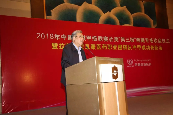 中國(guó)圍棋協(xié)會(huì)主席林建超將軍在致辭中表示,拉薩棋院西藏阜康醫(yī)藥職業(yè)圍棋隊(duì)沖甲成功是全國(guó)圍棋運(yùn)動(dòng)中的一件大事。它首先改變了當(dāng)代中國(guó)圍棋運(yùn)動(dòng)的版圖,雪域高原第一次在中國(guó)圍棋甲級(jí)聯(lián)賽中占有了一席之地;其次,這次沖甲實(shí)現(xiàn)了西藏體育發(fā)展的一次突破,使西藏在全國(guó)性的體育賽事中,擁有了第一支甲級(jí)職業(yè)隊(duì)伍;第三,本次沖甲成功,為圍棋文化和藏式棋類文化的交融促進(jìn)提供了一個(gè)很好的契機(jī),為西藏地區(qū)棋文化的發(fā)展起到了很好的推動(dòng)作用。這項(xiàng)成績(jī)來之不易,首先應(yīng)該歸功于自治區(qū)各級(jí)黨委、政府的重視,尤其是齊扎拉主席長(zhǎng)期以來對(duì)包括圍棋、藏式棋等棋類活動(dòng)的支持,有效促進(jìn)了這項(xiàng)中華民族優(yōu)秀傳統(tǒng)文化在雪域高原的普及與發(fā)展,這是與習(xí)近平總書記在十九大報(bào)告中提出的戰(zhàn)略目標(biāo)相一致的。