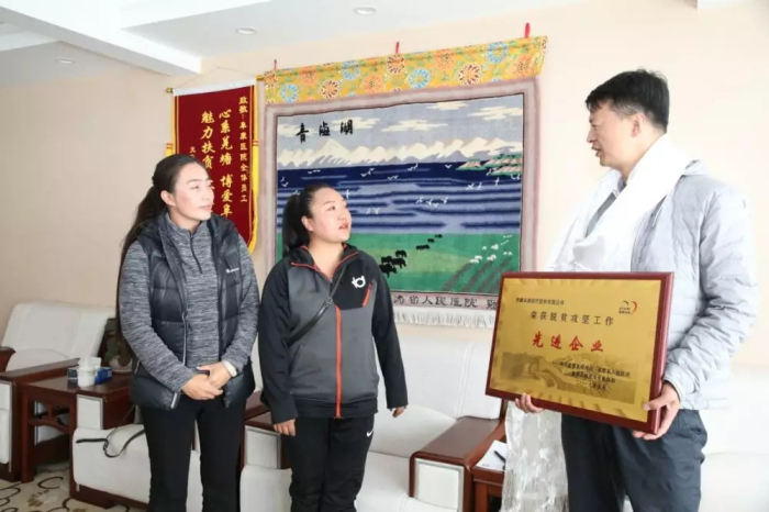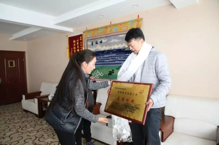 隨后,才旦卓嘎向阜康醫(yī)療股份有限公司黨委書(shū)記、董事長(zhǎng)王斌頒發(fā)“脫貧攻堅(jiān)工作先進(jìn)企業(yè)”匾牌。