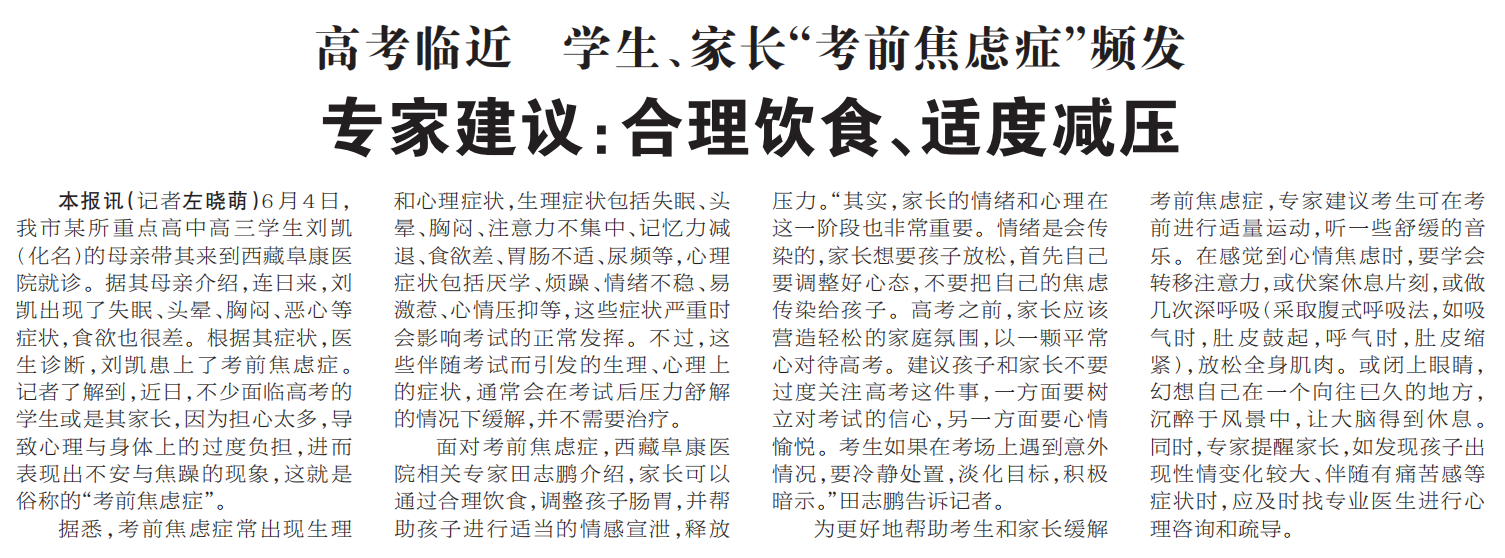 面對考前焦慮癥,西藏阜康醫(yī)院相關(guān)專家田志鵬介紹,家長可以通過合理飲食,調(diào)整孩子腸胃,并幫助孩子進行適當(dāng)?shù)那楦行?,釋放壓力?ldquo;其實,家長的情緒和心理在這一階段也非常重要。情緒是會傳染的,家長想要孩子放松,首先自己要調(diào)整好心態(tài),不要把自己的焦慮傳染給孩子。高考之前,家長應(yīng)該營造輕松的家庭氛圍,以一顆平常心對待高考。建議孩子和家長不要過度關(guān)注高考這件事,一方面要樹立對考試的信心,另一方面要心情愉悅??忌绻诳紙錾嫌龅揭馔馇闆r,要冷靜處置,淡化目標,積極暗示。”田志鵬告訴記者。