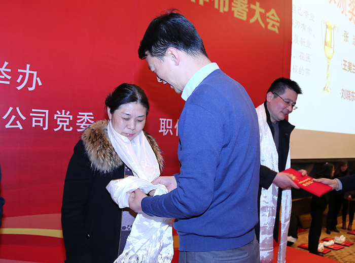 王斌董事長、劉瀟瀟總經理等院領導為先進科室、優(yōu)秀員工頒發(fā)獎章及獎金