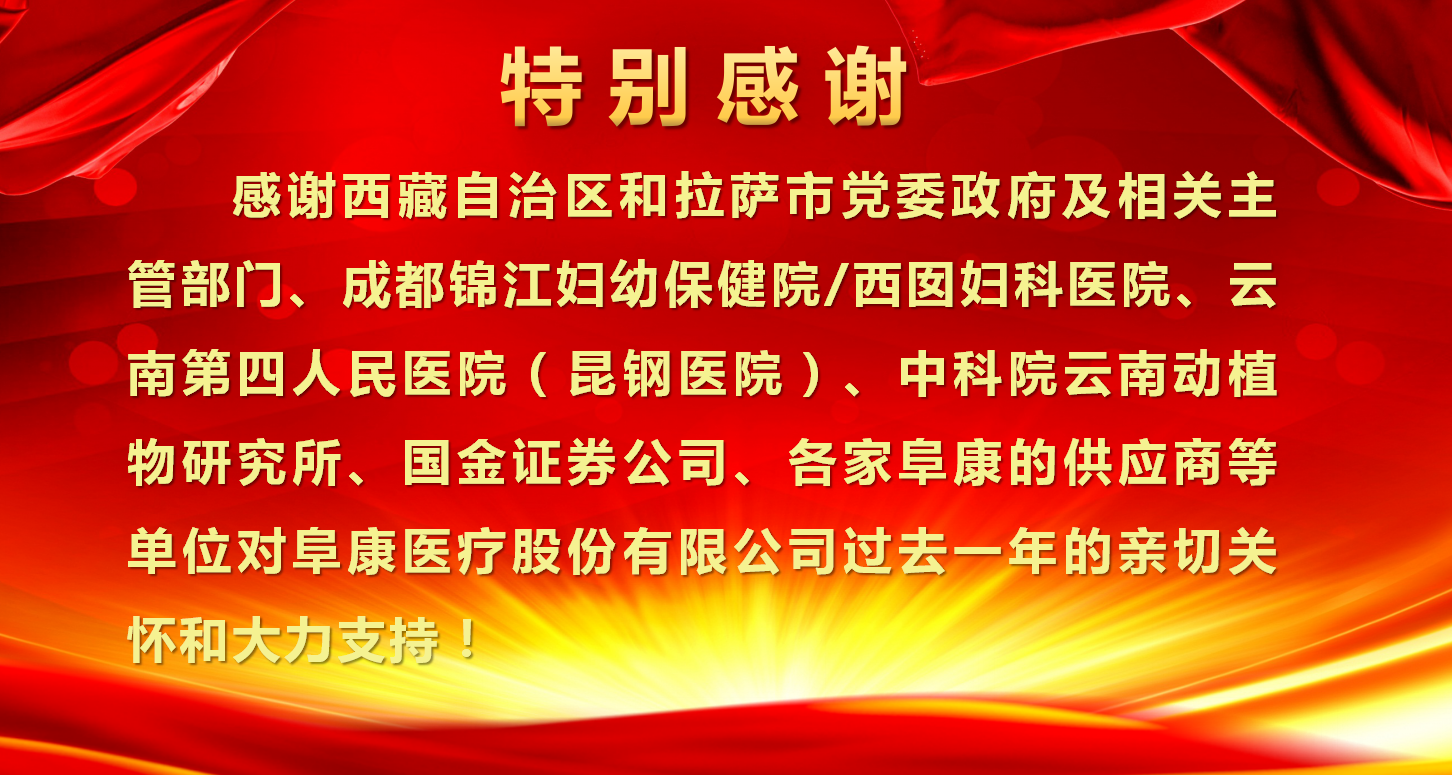 我之存在,因為有你;百年阜康,感恩有您。感恩是一種態(tài)度、一種美德、一種情懷!不忘初心、砥礪前行,感謝你們的一路陪伴,阜康的輝煌離不開每一位阜康人的奉獻,雄關(guān)漫道真如鐵,而今邁步重頭越!2018年將是阜康騰飛的一年,在各級領(lǐng)導關(guān)心下,各位同仁支持下,阜康一年更比一年好!以十九大精神為指導,努力打造“團結(jié)、創(chuàng)新、規(guī)范、節(jié)約、用心”五位一體的現(xiàn)代化醫(yī)院!為西藏人民群眾解決看病遠、看病難、看病貴的問題,全心全意為西藏人民健康服務!
