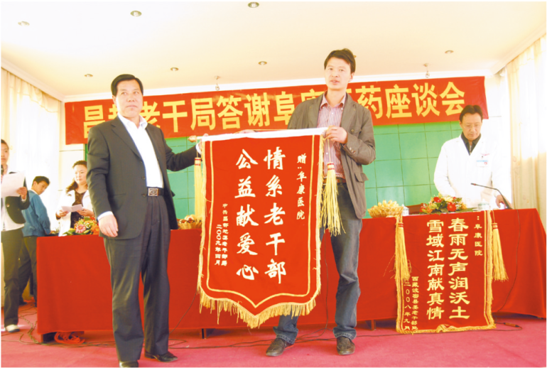 2009年4月29日.上午,阜康醫(yī)院在醫(yī)院康復(fù)中心召開了” 昌都老干局答謝阜康公司座談會”,昌都地委老干部局局長張定杰、自治區(qū)黨委老干部局安置處處長謝青林、自治區(qū)黨委老干部局安置處主任科員麻召法、阜康醫(yī)藥發(fā)展有限公司董事長王斌、阜康醫(yī)院院長嘎布、阜康醫(yī)院黨支部書記張德才參加了座談會,昌都地委老干部局張定杰局長及自治區(qū)黨委老干部局安置處謝青林處長代表波密縣老干部局向阜康醫(yī)院獻上錦旗,以答謝阜康公司對昌都老干部的關(guān)心和援助。