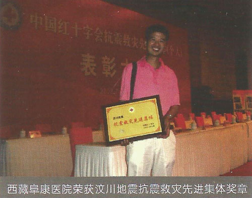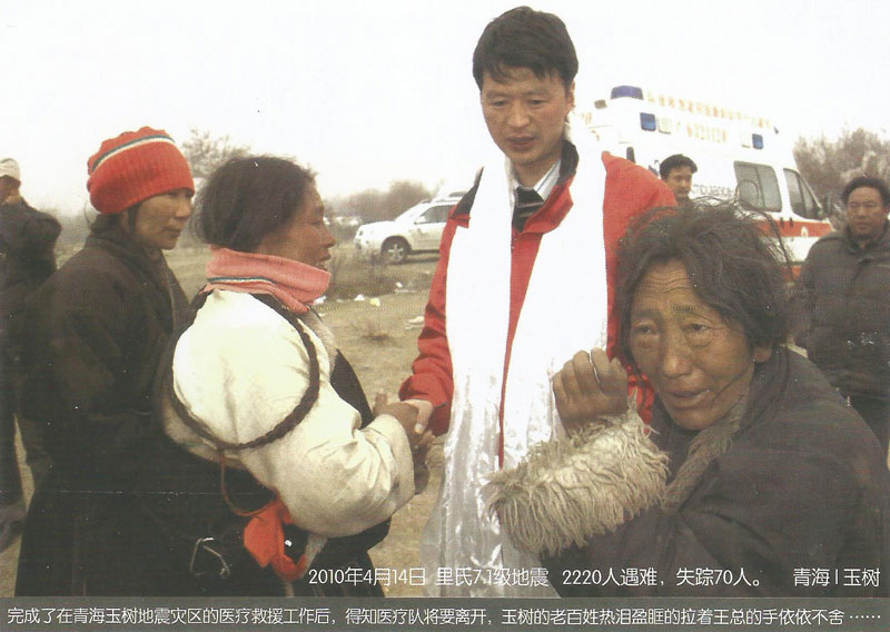 2008年5月12日14時28分,在得知發(fā)生在四川汶川8級的強烈地震后,王斌被深深的震撼了,5月13日第一時間帶頭捐款并號召全公司347名員工為災(zāi)區(qū)人民獻愛心,在王斌的帶領(lǐng)下短短的一上午公司即向西藏紅十字會捐款10062萬元(其中王斌個人捐款5062萬元)。13日下午,王斌隨即召開阜康醫(yī)院醫(yī)務(wù)人員趕赴災(zāi)區(qū)醫(yī)療救援動員大會,并迅速組建了一支由他本人作為領(lǐng)隊的26人醫(yī)療救援隊。同時他還帶領(lǐng)醫(yī)療隊為盡快抵達地震災(zāi)區(qū)并第一時間參與醫(yī)療救援,而且決定在成都臨時購買一輛配備完善的救護車,還包括大量藥品、生活物品、以及部分醫(yī)療設(shè)備,此次救災(zāi)共投入130余萬元。