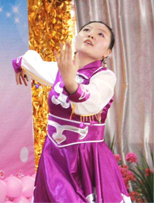 丹丹告訴筆者,之所以會(huì)選擇“鴻雁”這支舞蹈,是因?yàn)橄矚g上了“鴻雁”那首歌,歌聲悠揚(yáng)婉轉(zhuǎn),仿佛把她帶到了大草原,看到了美麗的牧羊姑娘,看到了悠閑的馬兒,看到了像白蓮花般盛開的氈包……因?yàn)檎也坏胶线m的舞伴,丹丹只好把這支集體舞改成了獨(dú)舞,練習(xí)中她不是純粹的模仿,也會(huì)適當(dāng)?shù)馗木帯>毩?xí)鴻雁時(shí)自己傷佛也變成了一只北歸的大雁,那是一種很奇妙的感覺。能夠在此次演出中獲得大家的認(rèn)可更是堅(jiān)定了她練習(xí)舞蹈的決心,丹丹表示會(huì)繼續(xù)練習(xí)舞蹈,爭取在下一次的演出中帶給大家更美的視覺盛宴。