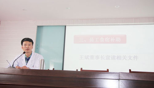 在談到員工食宿補(bǔ)助時(shí),王斌董事長(zhǎng)宣讀了相關(guān)文件,并就一些問(wèn)題做出了解釋?zhuān)簡(jiǎn)T工的食堂補(bǔ)助由原來(lái)的四百元上漲到五百元;從六月份起,由三家醫(yī)院拿出部分收入補(bǔ)貼員工住宿,如此住宿補(bǔ)貼由原來(lái)的一百四十元上漲到二百四十元。以此來(lái)提高全體員工的食宿質(zhì)量,并以此來(lái)保證低收入者不為一日三餐所發(fā)愁,減輕低收入者們的生活壓力。為此,王斌董事長(zhǎng)還要求綜合辦公室下發(fā)文件,要求食堂提高飯菜質(zhì)量,保證員工吃上品種多樣且營(yíng)養(yǎng)又衛(wèi)生的飯菜。對(duì)此,張德才院長(zhǎng)發(fā)表了自己的一些看法,也談了關(guān)于食堂的一些改革,并對(duì)王斌董事長(zhǎng)的這項(xiàng)決議表示了大力支持。