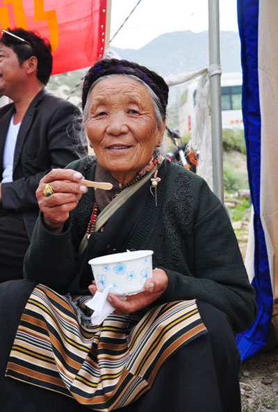 藏戲演出為另一重頭戲。從雪頓節(jié)的第二天開始,在羅布林卡及宗角祿康公園內(nèi),藏戲隊(duì)伍每天不停歇地從上午11點(diǎn)一直唱到暮色降臨。據(jù)說,因時(shí)間有限,這已經(jīng)是提取劇目中的精華部分,否則一出戲會(huì)唱上幾天。表演者自得其樂,觀賞者更是樂此不疲。卡墊鋪在草地上,親朋好友閑適地圍坐在一起,擺上一路背來的青稞酒、酥油茶,還有自己做的各種藏式點(diǎn)心。很多藏民一邊聽著藏戲,一邊搖著手中的轉(zhuǎn)經(jīng)筒,或是捻著佛珠,臉上露出幸福的微笑。