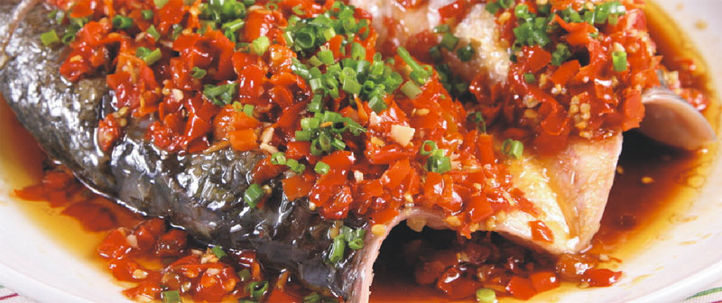 剁椒魚頭屬湘菜系,是湘潭的一道名菜。據(jù)說可以追溯到雍正年間,當(dāng)時(shí)正大興文字獄,著名的反清文人黃宗憲,在出逃的路上,途經(jīng)湖南的一個小鄉(xiāng)村,借住在一個貧苦的農(nóng)戶家。怡好農(nóng)戶的兒子從田間池塘中捕回一條河魚,解了女主人的巧婦之愁,于是就用河魚做菜。魚洗凈后,魚肉放鹽煮湯,再用自家產(chǎn)的辣椒剁碎后與魚頭同蒸,不想黃宗憲吃了覺得非常鮮美?;丶液?,他讓家里的廚師將這道菜加以改良,于是便有了今天的“剁椒魚頭”。