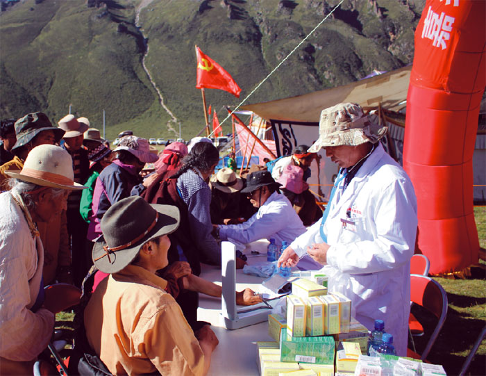 七月賽馬節(jié)期間,應(yīng)嘉黎縣縣政府及申扎縣縣委縣政府的真誠(chéng)邀請(qǐng)。2015年7月25日,西藏阜康醫(yī)院義診隊(duì)帶著醫(yī)院的囑托、8萬(wàn)元的藥品分別向嘉黎縣、申扎縣出發(fā)。7月26日,賽馬場(chǎng)里人頭攢動(dòng),熱鬧非凡。在西藏阜康醫(yī)院義診點(diǎn),在工作人員的維持下,大家排起了長(zhǎng)隊(duì),自覺(jué)有序地等待著專(zhuān)家給他們?cè)\治。專(zhuān)家們?yōu)槿罕姕y(cè)量血壓、診斷病情,耐心解答他們的提問(wèn),同時(shí)就高原常見(jiàn)病、多發(fā)病的防治知識(shí)進(jìn)行了認(rèn)真講解,增強(qiáng)了群眾的自我保健意識(shí)。
