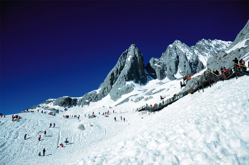 人文的掃興,索性來場自然之旅。第二天一大早我們就前往了玉龍雪山,還是被告知到達(dá)最高峰的索道票昨日售盡,我們的索道只到得了松杉坪?;貞浧饋恚@也許值得慶幸。松杉坪松樹高聳如云,木棧道旁有積雪未化,風(fēng)過樹梢的積雪隨風(fēng)灑落,偶爾有小松鼠一躍而過,牦牛悠閑自在的吃著草,遠(yuǎn)處是玉龍雪山的最高峰,仿佛近在咫尺。我想所有的生生死死都應(yīng)該在這里戛然而止,所有浮躁的靈魂都應(yīng)該在這里接受洗禮,進(jìn)入輪回,拋卻紅塵暫享這片刻的永生。她是我去過最接近天堂的地方,