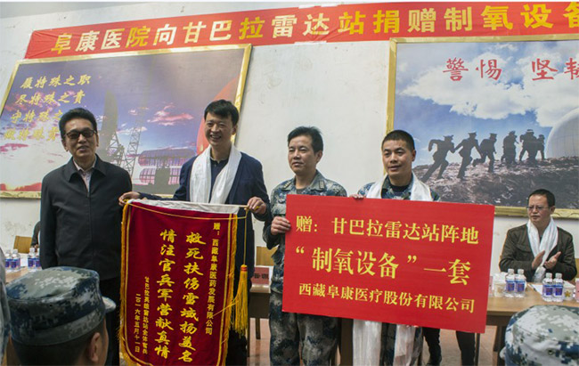 2016年5月11日,西藏阜康醫(yī)院有限公司向甘巴拉雷達(dá)站捐贈制氧設(shè)備儀式在甘巴拉雷達(dá)站營地舉行,西藏自治區(qū)政協(xié)副主席、區(qū)工商聯(lián)主席、區(qū)總商會會長阿沛·晉源,區(qū)工商聯(lián)副主席劉洪,區(qū)工商聯(lián)政研室主任張云寶,區(qū)工商聯(lián)經(jīng)聯(lián)處副處長秦林,95662部隊政治委員楊壽保,甘巴拉雷達(dá)站政治教導(dǎo)員李再華,西藏阜康醫(yī)療股份有限公司黨委書記、董事長王斌,黨委副書記、總院長張德才,黨委紀(jì)檢委員、總經(jīng)理陳彬以及甘巴拉雷達(dá)站全體官兵等出席了本次捐贈儀式。