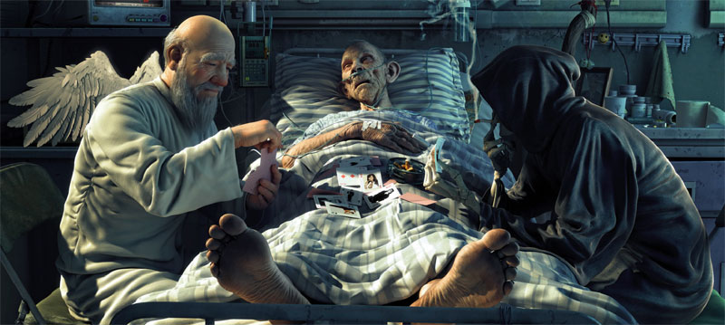 一個將死之人,在彌留之際,發(fā)現(xiàn)身邊坐著兩個人,魔鬼和天使。他們在床邊玩牌,并以牌局論輸贏,賭這個人的靈魂是飛到天堂,還是下到地獄。他緊張地看著牌局,不知道自己的命運會怎樣。